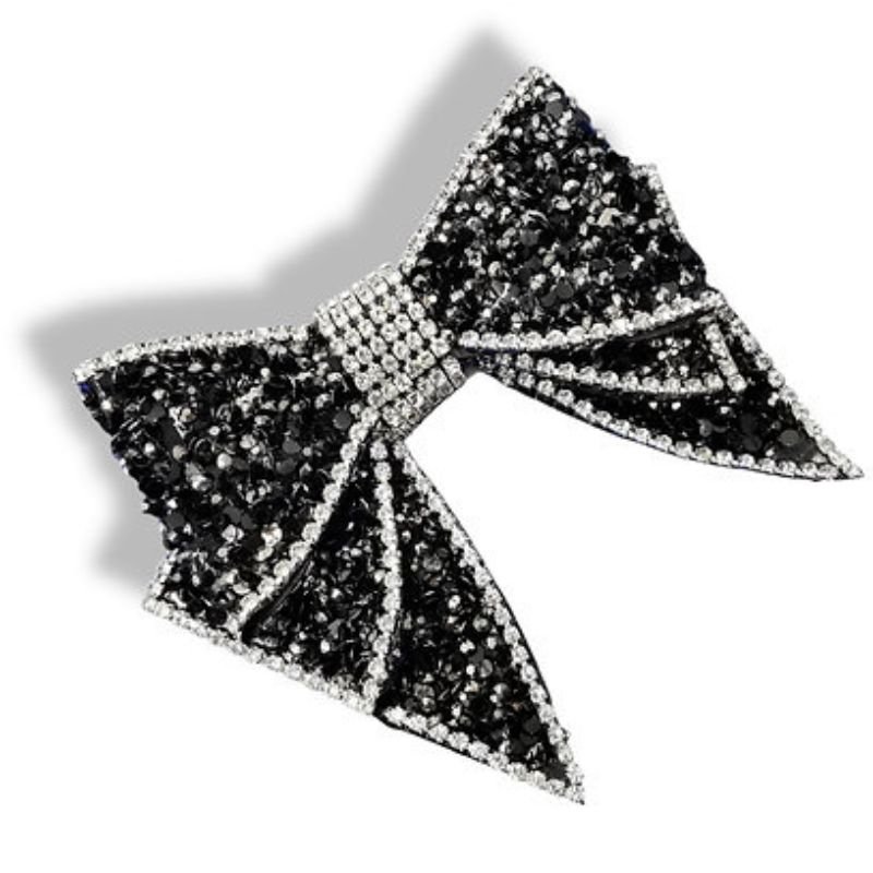 Applicazione a forma di Fiocco, realizzato con strass neri e file di strass crystal che compongono il nodo e i bordi.