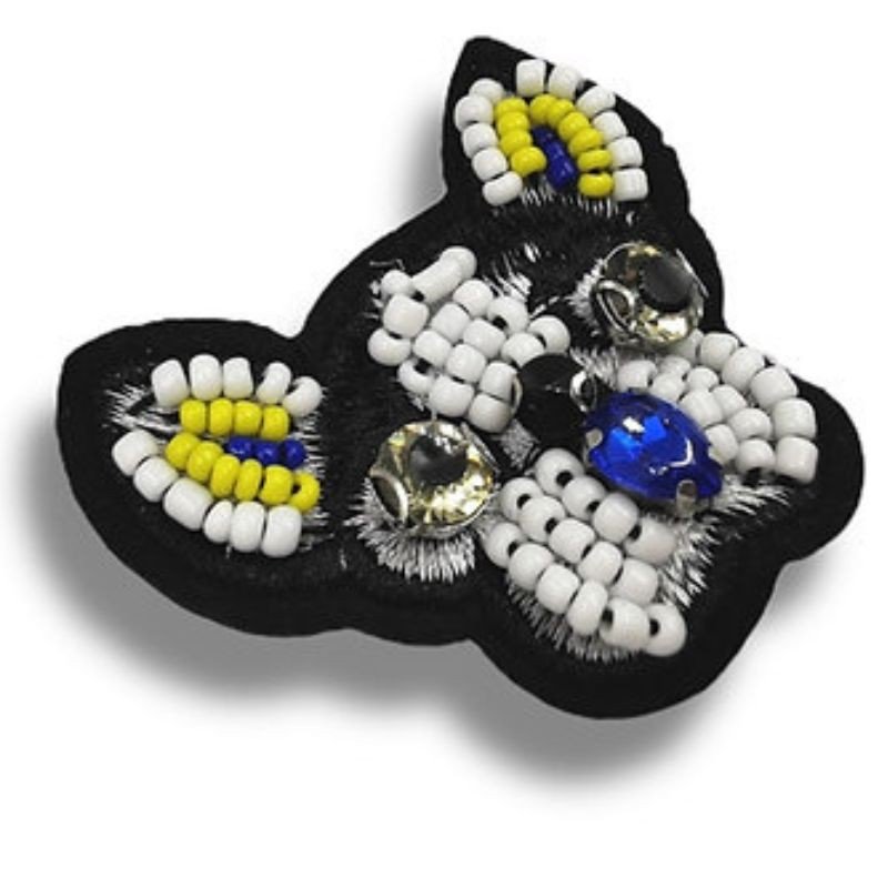 Applicazione a forma di Cane interamente ricamata a mano e impreziosita da Corallini e Pietre in Vetro cucite a mano.