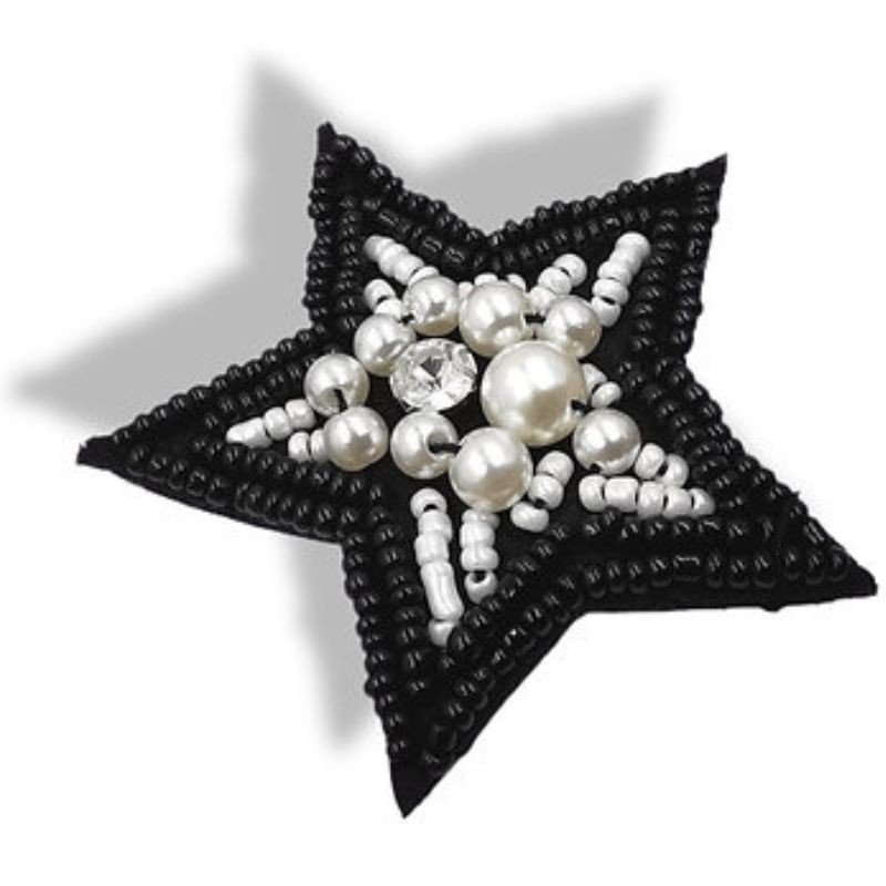 Applicazione a forma di Stella, realizzata con perline, corallini e due catene di corallini neri che ne delineano il bordo.