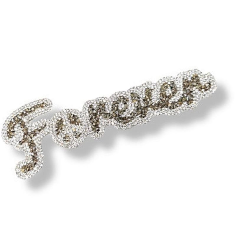 Applicazione termoadesiva, la scritta internamente è realizzata con corallini bicono, esternamente è composta da file di strass.
