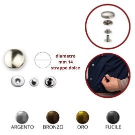 Bottoni strappo dolce a pressione in ottone mm 14 per abbigliamento, borse, tendaggi. Bottoni composti da 4 pezzi applicabili con apposito torchietto (011425 campo ricerca) e punzone (011424) di riferimento. Prezzo riferito a 100 pezzi (per ogni componente).