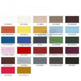 | Colore | 516 fucsia, 520 bordeaux, 542 celeste chiaro, 863 melanzana, 864 vinaccia, A24 fango, 007 cammello, 021 bordeaux scuro, 501 bianco, 504 giallo, 512 rosa chiaro, 528 verdino, 545 celeste, 557 celestone, 560 blu, 570 marrone, 572 beige, 574 perla, 578 grigio, 580 nero, 820 rosso, 841 panna, 844 giallo ocra, 890 verdone, A46 grigio scuro, A51 terracotta, A72 blu royale |