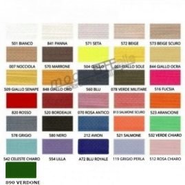 | Colore | 516 fucsia, 520 bordeaux, 542 celeste chiaro, 547 turchese, 554 lilla, 571 seta, 573 beige scuro, 848 giallo oro, 001 giallo sole, 007 nocciola, 070 rosa antico, 078 verde miliatre, 119 grigio perla, 212 avion, 501 bianco, 504 giallo, 509 giallo senape, 512 rosa chiaro, 521 salmone, 523 arancione, 532 verde chiaro, 540 verde bandiera, 560 blu, 570 marrone, 572 beige, 578 grigio, 580 nero, 813 salmone scuro, 820 rosso, 841 panna, 844 giallo ocra, 890 verdone, 911 verde salvia, A72 blu royale |