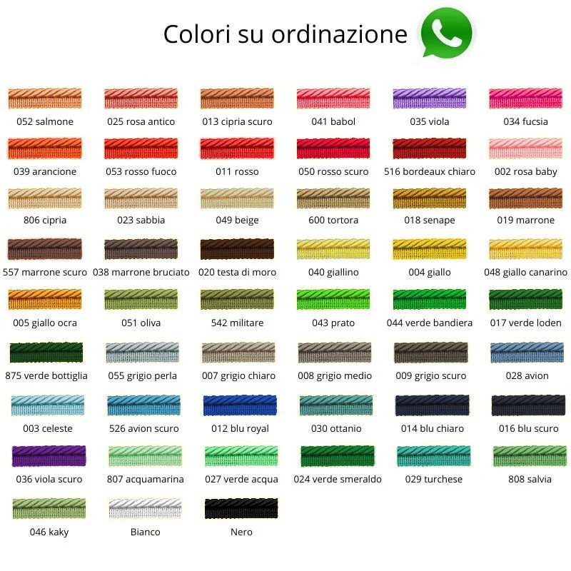 Cordoncino ritorto (3 capi) con aletta in materiale acetato 50%(simile alla seta) e cotone 50%, il suo diametro è di mm 6,5. Il prezzo è riferito a confezione da 20 metri