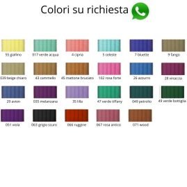 | Colore | 001 bianco, 002 rosa, 011 grigio chiaro, 013 grigio medio, 018 fuxia, 019 rosso, 020 bordò, 021 marrone, 023 nero, 031 beige, 032 verde militare, 046 arancione, 050 blu notte, 058 verde, 065 giallo sole, 068 beige scuro |