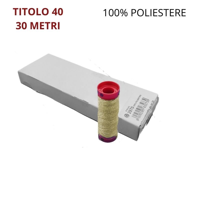 Filato speciale metalizzato per cucito e per cuciture ornamentali, filato laminato 100% poliestere titolo 40 (filato più sottile) o titolo 30 (filato più spesso), spola da 30 metri.