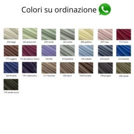 | Colore | 103 grigio scuro, 107 blu scuro, 111 marrone scuro, 112 bianco, 124 nero, 126 blu medio, 127 tampone, 154 verde smeraldo, 155 verde bandiera, 166 rosso, 178 verde, 183 giallo, 184 panna, 186 marrone, 194 verde bottiglia, 217 grigio, 221 beige, 230 grigio medio, 232 salmone, 233 corallo, 240 fuxia, 241 verde acqua, 247 rosa, 252 cammello, 256 bianco lana, 257 azzurro, 259 bordeaux, 261 senape, 262 viola, 263 turchese, 402 tortora, 403 sabbia, 405 fragola, 413 cerise, 414 verde petrolio, 415 arancio, 416 verde acido, 422 rosa antico, 425 celeste, 434 grigio perla, 435 grigio chiaro, 508 glicine, 702 lilla, 905 rosa antico |