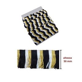 Frangia tripolino multicolr cm 5 composizione 100% acetato. Larghezza 5 cm, mix colori bianco, nero e lurex (oro).Prezzo riferito a pezza da 10 metri.