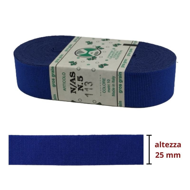 Nastro gros grain in materiale 64% cotone 36% poliestere, altezza cm 2,5. Prezzo riferito a pezza da 10 metri