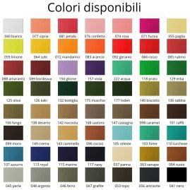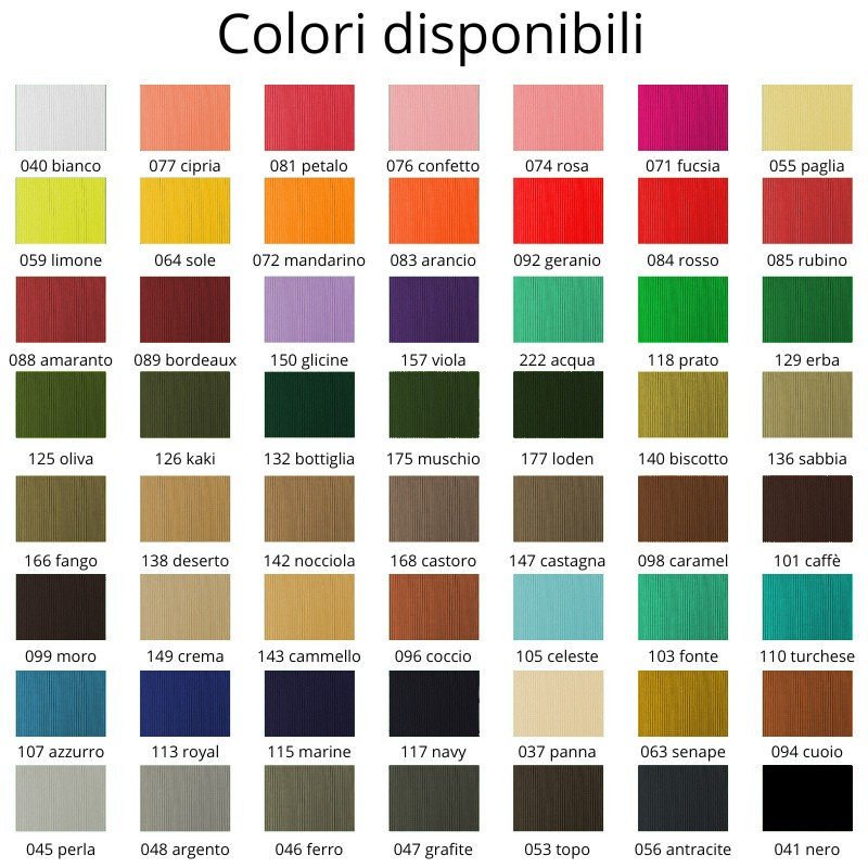 | Colore | 037 panna, 040 bianco, 041 nero, 045 perla, 046 ferro, 047 grafite, 048 argento, 053 topo, 055 paglia, 056 antracite, 059 limone, 063 senape, 064 sole, 071 fucsia, 072 mandarino, 074 rosa, 076 confetto, 077 cipria, 081 petalo, 083 arancio, 084 rosso, 085 rubino, 088 amaranto, 089 bordeaux, 092 geranio, 094 cuoio, 096 coccio, 098 caramel, 099 moro, 101 caffè, 103 fonte, 105 celeste, 107 azzurro, 110 turchese, 113 royal, 115 marine, 117 navy, 118 prato, 125 oliva, 126 kaki, 129 erba, 132 bottiglia, 136 sabbia, 138 deserto, 140 biscotto, 142 nocciola, 143 cammello, 147 castagna, 149 crema, 150 glicine, 157 viola, 166 fango, 168 castoro, 175 muschio, 177 loden, 222 acqua |