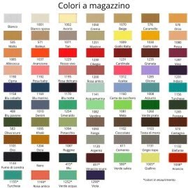 | Colore | 0408 blu pavone, 0535 malto, 0570 orzo, 0571 baileys, 0573 castagna, 0576 caramello, 0583 oliva scuro, 0611 cemento, 1001 bianco sposa, 1002 avorio, 1008 azzurro, 1009 giallo baby, 1010 denim, 1030 giallo sole, 1037 arancione, 1050 crema, 1070 beige, 1071 tan, 1080 pesca, 1081 mela, 1082 verdino, 1085 albicocca, 1087 ruggine, 1093 fango, 1094 pistacchio, 1095 khaki, 1101 oro, 1102 cioccolato, 1103 testa di moro, 1120 argento, 1131 grigio topo, 1132 elefante, 1133 fumo di londra, 1141 acquamarina, 1156 turchese, 1158 blu cobalto, 1160 carta da zucchero, 1169 blu marino, 1170 blu notte, 1190 cipria, 1192 rosa baby, 1195 rosa delicato, 1200 rosa antico, 1204 ocra, 1229 rosso vivo, 1230 ciliegia, 1231 cardinale, 1235 granata, 1251 mastice, 1254 smeraldo, 1260 verde prato, 1265 foresta, 1285 glicine, 1287 vino, 1291 indaco, 1312 azalea, Bianco, Nero |