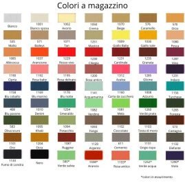 | Colore | 0408 blu pavone, 0535 malto, 0570 orzo, 0571 baileys, 0573 castagna, 0576 caramello, 0583 oliva scuro, 0611 cemento, 1001 bianco sposa, 1002 avorio, 1008 azzurro, 1009 giallo baby, 1010 denim, 1030 giallo sole, 1037 arancione, 1050 crema, 1070 beige, 1071 tan, 1080 pesca, 1081 mela, 1082 verdino, 1085 albicocca, 1087 ruggine, 1093 fango, 1094 pistacchio, 1095 khaki, 1101 oro, 1102 cioccolato, 1103 testa di moro, 1120 argento, 1131 grigio topo, 1132 elefante, 1133 fumo di londra, 1141 acquamarina, 1156 turchese, 1158 blu cobalto, 1160 carta da zucchero, 1169 blu marino, 1170 blu notte, 1190 cipria, 1192 rosa baby, 1195 rosa delicato, 1200 rosa antico, 1204 ocra, 1229 rosso vivo, 1230 ciliegia, 1231 cardinale, 1235 granata, 1251 mastice, 1254 smeraldo, 1260 verde prato, 1265 foresta, 1285 glicine, 1287 vino, 1291 indaco, 1312 azalea, Bianco, Nero |