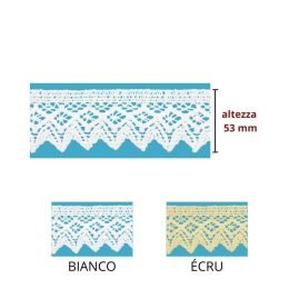 Pizzo fusello in 100% cotone, prodotto di alta qualità dimensione h mm 53. Prezzo riferito a pezza da 10 metri (taglio continuo a 10 metri)