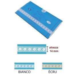 Pizzo fusello tramezzo in 100% cotone, prodotto di alta qualità ” Made in Biella dal 1991″ dimensione mm 14. Prezzo riferito a confezione da 10 metri.