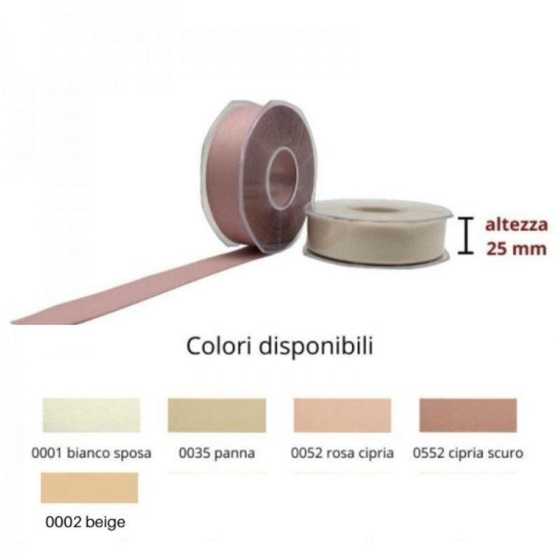 Nastro in policotone, decorativo, effetto opaco altezza del nastro mm 25. Prezzo riferito a rotolo da 25 metri