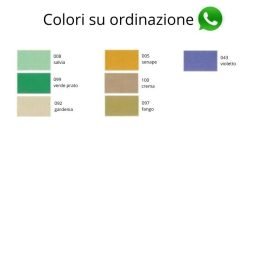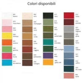 | Colore | 01 bianco, 02 ecrù, 06 cipria, 09 verde bottiglia, 10 oliva, 12 corda, 13 rosso, 14 granata, 15 blu elettrico, 16 zaffiro, 17 nero, 19 felce, 20 champagne, 21 avio, 22 celeste, 23 rosa, 24 palissandro, 25 blu notte, 26 cuoio, 27 grigio argento, 28 ghisa, 29 fumo, 30 mimosa, 31 arancio, 32 smeraldo, 33 fucsia, 34 castagna, 36 ruggine, 37 viola, 39 noce, 41 verde loden, 44 gemma, 73 rosa chiaro, 80 giallo sole |