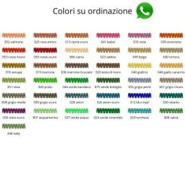 | Colore | 002 rosa baby, 003 celeste, 004 giallo, 005 giallo ocra, 006 panna, 011 rosso, 014 blu chiaro, 015 bordeaux, 016 blu scuro, 017 verde loden, 022 crema, 026 giallo oro, 034 fucsia, 054 seta, 516 bordeaux chiaro, 542 verde militare, 557 marrone scuro, Bianco, Nero |
