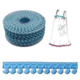 Bordo frangia con pon pon in 100% poliestere, per abbellire capi di abbigliamento o accessori da donna e bimba, altezza mm 13.