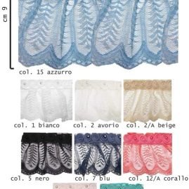 Passamaneria moda donna composizione: 80% poliestere 20% nylon, per allungare ed abbellire abiti. Altezza cm 9. Prezzo riferito a confezione da 6,50 metri