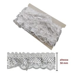 Passameria moda donna in pizzo e raso pois, utile per allungare e abbellire abiti da donna. Altezza cm 5. Prezzo riferito a confezione da 5 metri