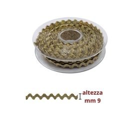 Agremano zig zag, gallone intrecciato (poliestere e cotone) laminato, indicato per decorazioni pregiate di vario genere, dimesnsione mm 9. Prezzo a confezione da 20 metri