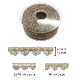 Frangiolina in 100% lino, indicata per arredo tessile casa, abbigliamento e accessori, altezza mm 15. Prezzo riferito a confezione da 20 metri