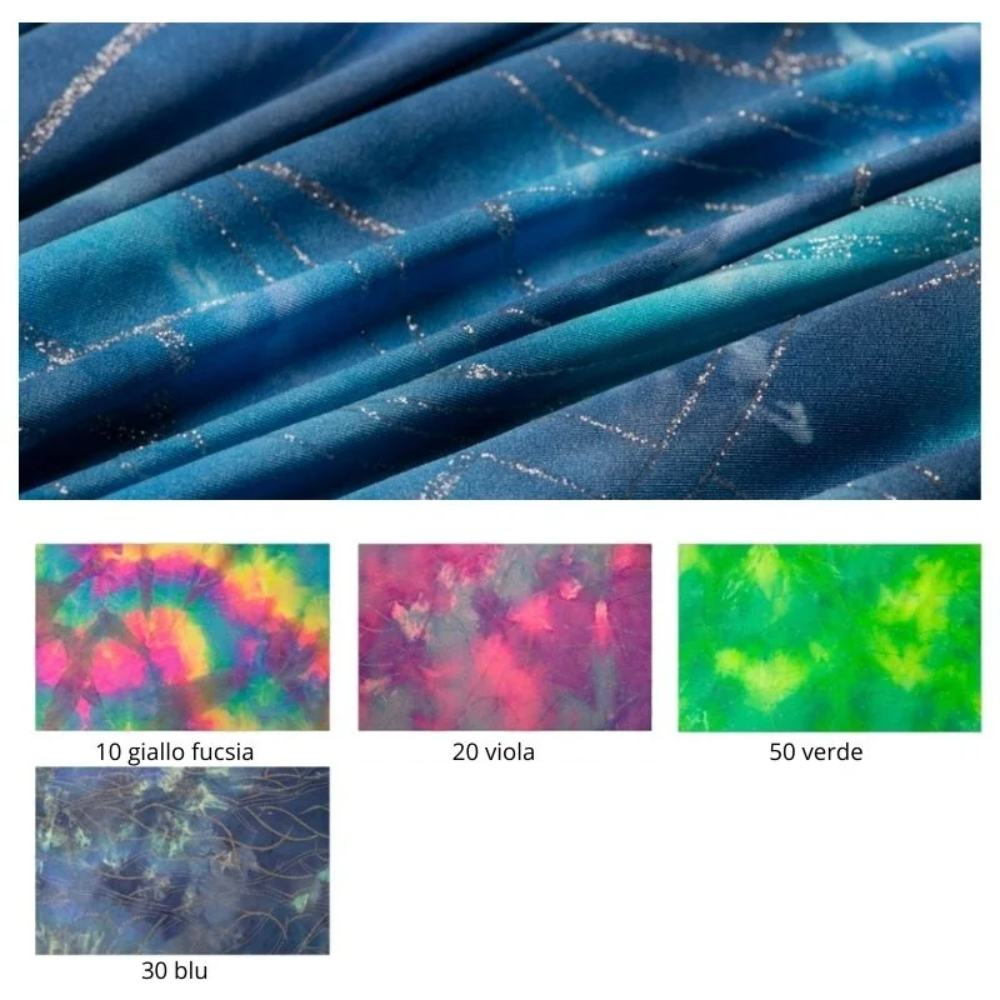 Tessuto in lycra per danza e spettacolo altezza cm 150, peso 300 grammi riferito a 100 cm x 150 cm (1 metro lineare) Composizione: 80% Poliammide 20% Elastan Prezzo a metro (taglio minimo d’acquisto 10 metri)